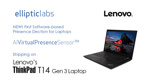Oslo, Norway — Elliptic Labs (EuroNext Growth: ELABS.OL), a global AI software company and the world leader in AI Virtual Smart Sensors™, announced that its AI Virtual Presence Sensor will be making its laptop debut on Lenovo's top-selling ThinkPad T14 laptop. Elliptic Labs' AI Virtual Smart Sensor Platform™ brings the first software-only human presence detection solution, the AI Virtual Presence Sensor, to the commercially and critically successful ThinkPad T14. Elliptic Labs' AI Virtual Presence Sensor enables the laptop to automatically lock or unlock whenever the user leaves or returns to the screen, making the laptop more secure while reducing power consumption. Elliptic Labs' platform combines ultrasound, sensor fusion, and proprietary machine learning (ML) tools together in order to make laptops — and devices at large — smarter. Lenovo, the largest PC manufacturer in the world, will be the first in the market to bring the benefits of this technology to users.