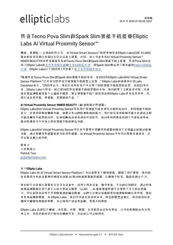 挪威,奥斯陆 — 全球AI软件公司、 AI Virtual Smart Sensors™的世界领导者Elliptic Labs(OSE: ELABS)推出的技术目前已在超过五亿台设备上部署。近日,该公司宣布其AI Virtual Proximity Sensor™ INNER BEAUTY®在传音最新发布的Tecno Pova Slim和Spark Slim智能手机上搭载。传音Pova Slim采用了Elliptic Labs的合作伙伴联发科的天玑6400芯片组,而Spark Slim则采用了联发科的Helio G200芯片组。Elliptic Labs已于2025年1月签署了此次合作的相关协议。