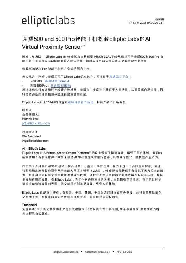 挪威,奥斯陆 — Elliptic Labs 的 AI 虚拟接近传感器 INNER BEAUTY®现已应用于荣耀500和500 Pro 智能手机,带来稳定及AI赋能的接近感应功能,同时实现更简洁的设计与更低的硬件复杂度。