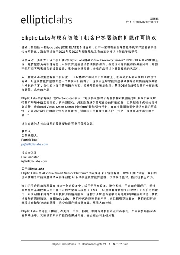挪威,奥斯陆 — Elliptic Labs (OSE: ELABS)今日宣布,已与一家现有的全球智能手机客户签署新的授权许可协议,涵盖预计将于2026年及2027年期间陆续发布的五款或以上智能手机型号。
