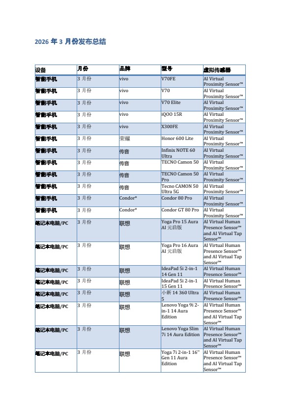 这12款智能手机覆盖多个OEM生态系统,包括vivo,其5款机型覆盖从中端到旗舰的多个价位段,同时还包括荣耀以及传音旗下Infinix与TECNO等多个细分市场品牌,以及在区域市场持续拓展的Condor。所有智能手机均搭载AI Virtual Proximity Sensor INNER BEAUTY®,一项完全基于软件的可替代传统硬件传感器的解决方案。
