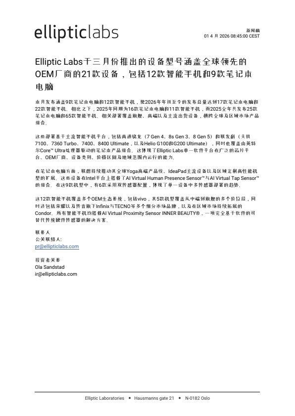 这些部署基于主流智能手机平台,包括高通骁龙(7 Gen 4、8s Gen 3、8 Gen 5)和联发科(天玑 7100、7360 Turbo、7400、8400 Ultimate,以及Helio G100和G200 Ultimate),同时也覆盖由英特尔Core™ Ultra处理器驱动的笔记本产品组合。这体现了Elliptic Labs单一软件平台在广泛的芯片平台、OEM厂商、设备类别、价格区间及地域范围内运行的能力。
