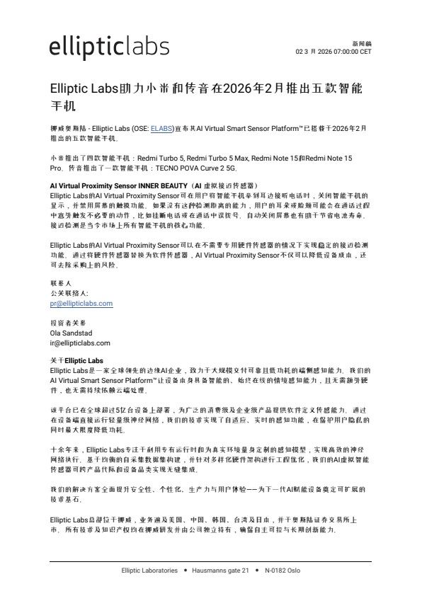 挪威奥斯陆 – Elliptic Labs (OSE: ELABS)宣布其AI Virtual Smart Sensor Platform™已搭载于2026年2月推出的五款智能手机。