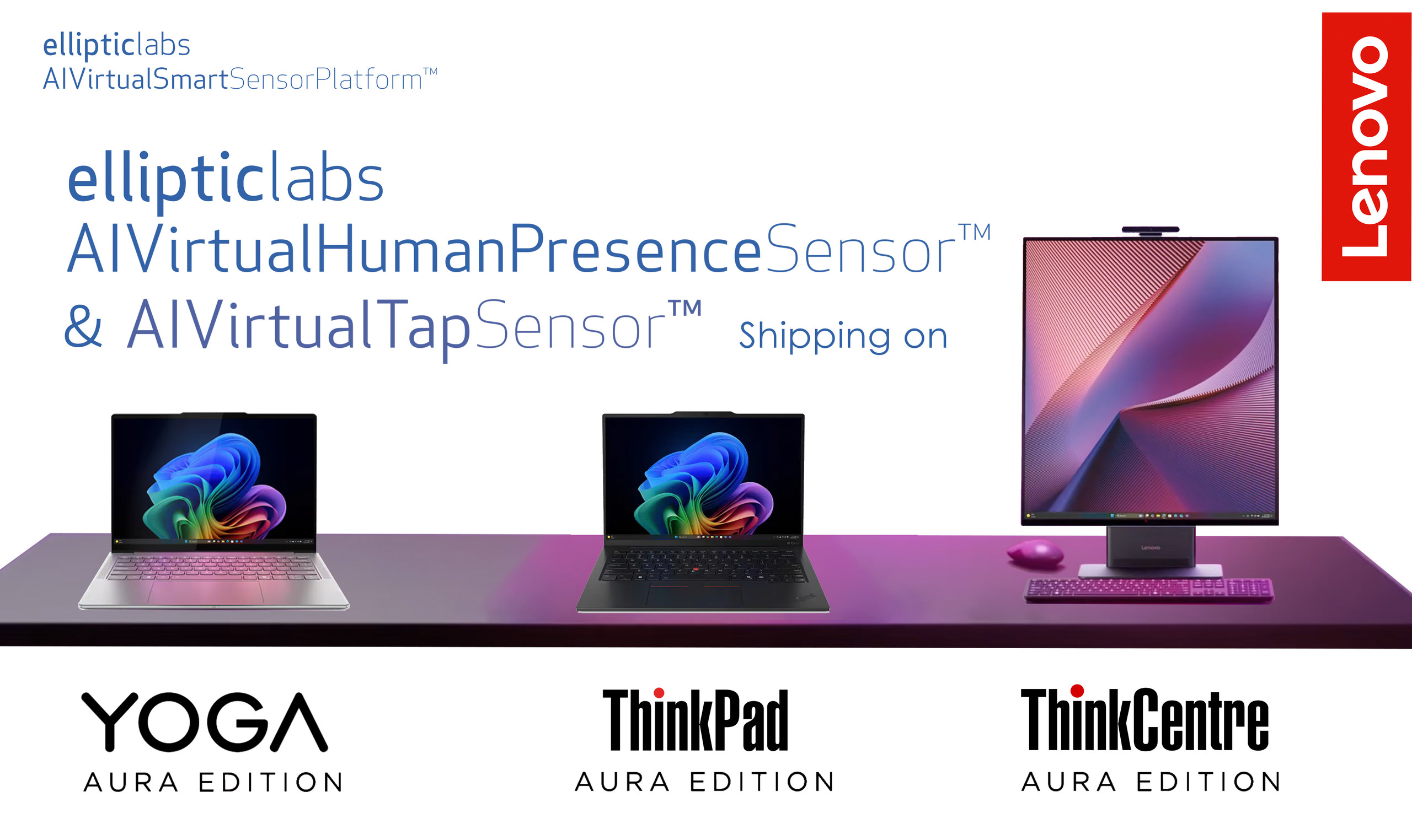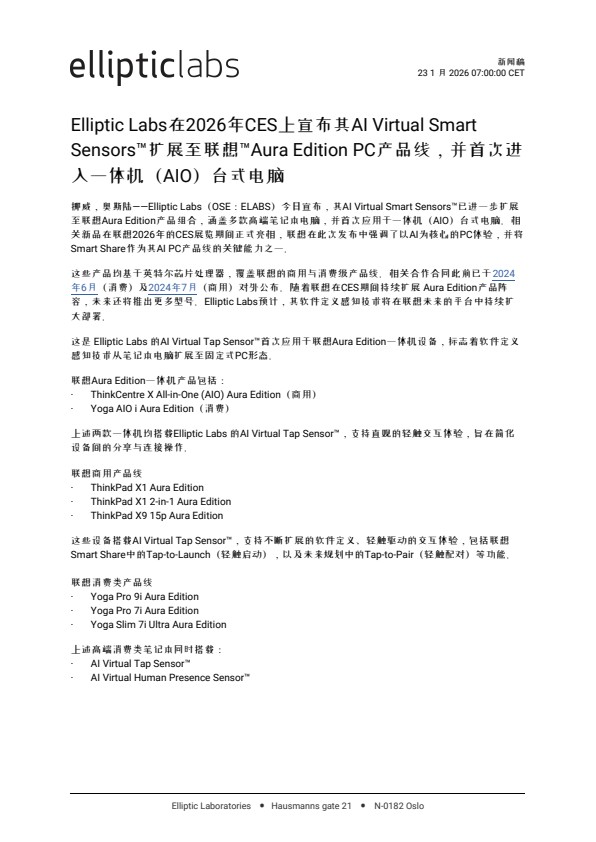 挪威,奥斯陆——Elliptic Labs(OSE:ELABS)今日宣布,其AI Virtual Smart Sensors™已进一步扩展至联想Aura Edition产品组合,涵盖多款高端笔记本电脑,并首次应用于一体机(AIO)台式电脑。相关新品在联想2026年的CES展览期间正式亮相,联想在此次发布中强调了以AI为核心的PC体验,并将Smart Share作为其AI PC产品线的关键能力之一。