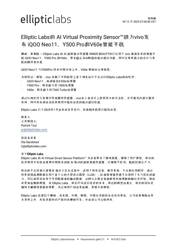 挪威,奥斯陆 — Elliptic Labs 的 AI 虚拟接近传感器 INNER BEAUTY®已应用于 vivo 最新发布的智能手机 iQOO Neo11、Y500 Pro 和V60e,带来稳定及AI赋能的接近感应功能,同时实现更简洁的设计与更低的硬件复杂度。