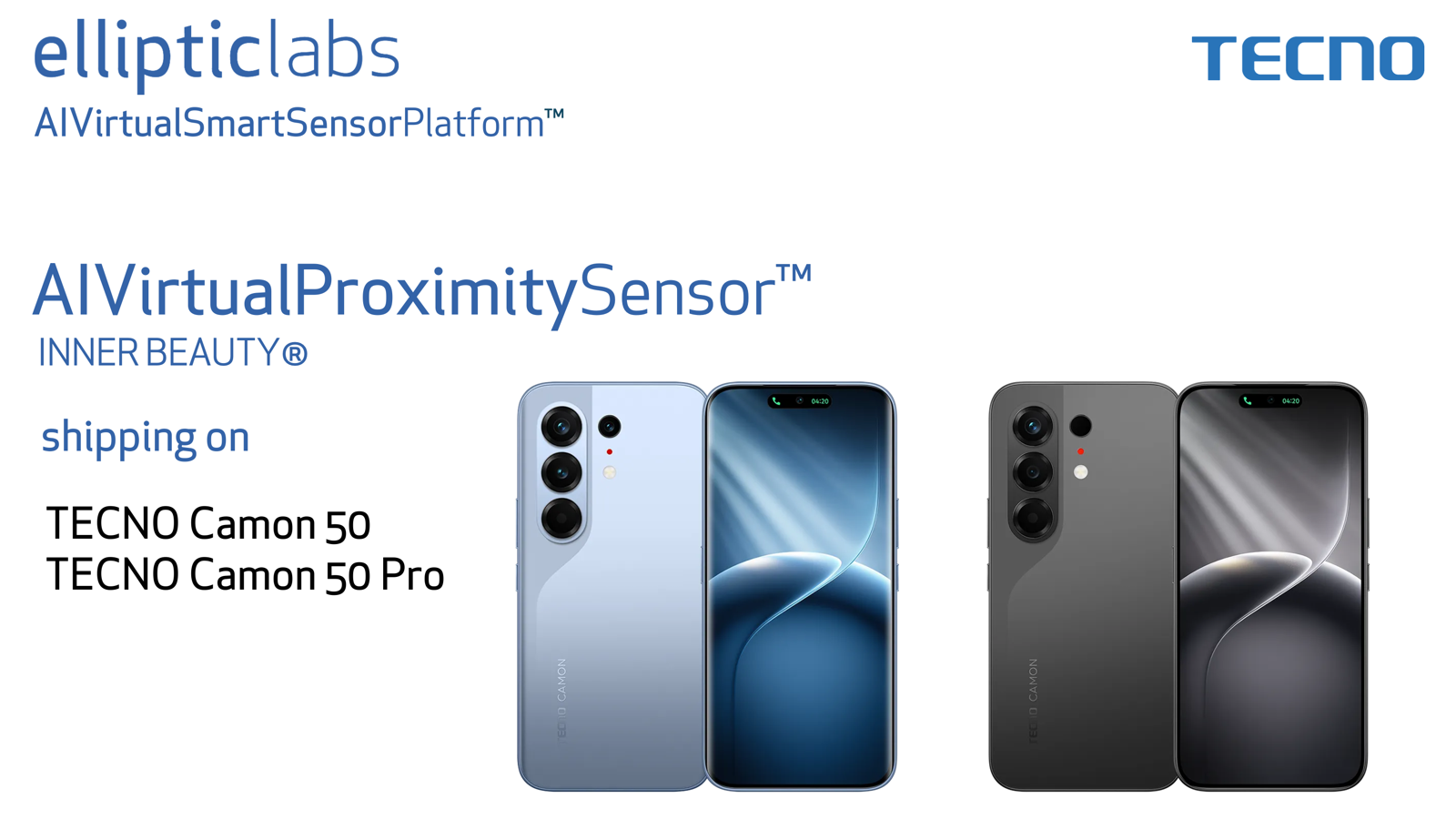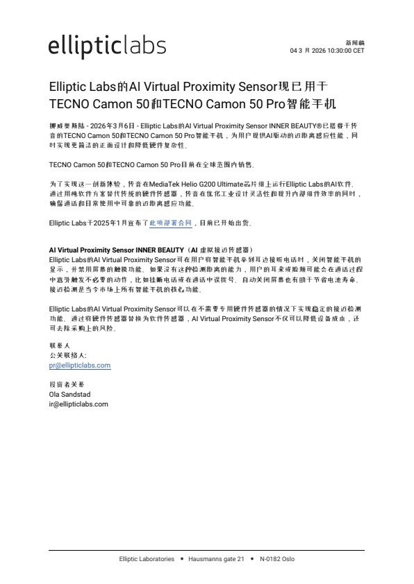 挪威奥斯陆 – 2026年3月6日 – Elliptic Labs的AI Virtual Proximity Sensor INNER BEAUTY®已搭载于传音的TECNO Camon 50和TECNO Camon 50 Pro智能手机,为用户提供AI驱动的近距离感应性能,同时实现更简洁的正面设计和降低硬件复杂性。
