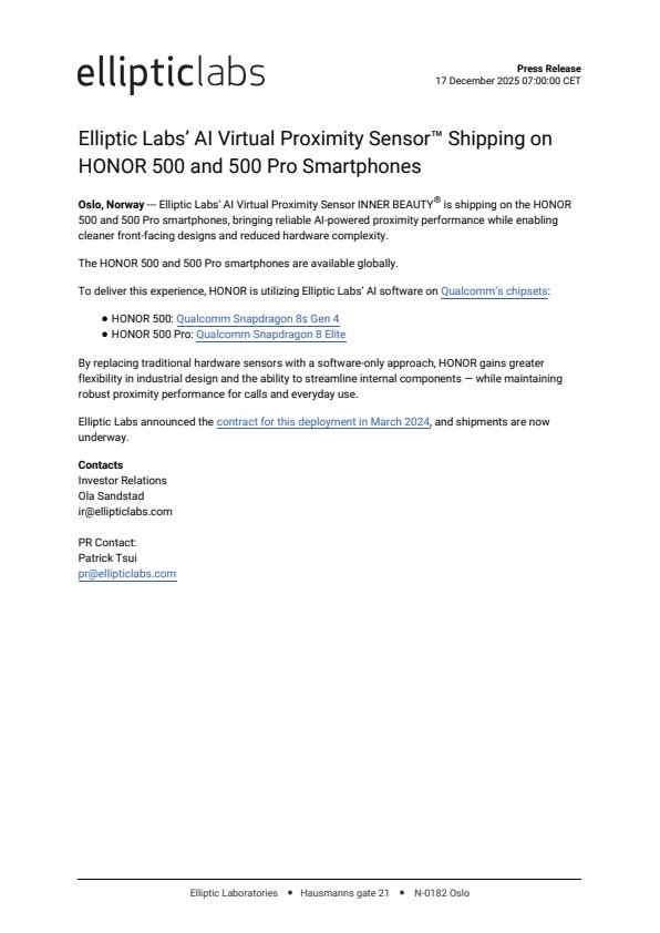 Oslo, Norway — Elliptic Labs’ AI Virtual Proximity Sensor INNER BEAUTY® is shipping on the HONOR 500 and 500 Pro smartphones, bringing reliable AI-powered proximity performance while enabling cleaner front-facing designs and reduced hardware complexity.