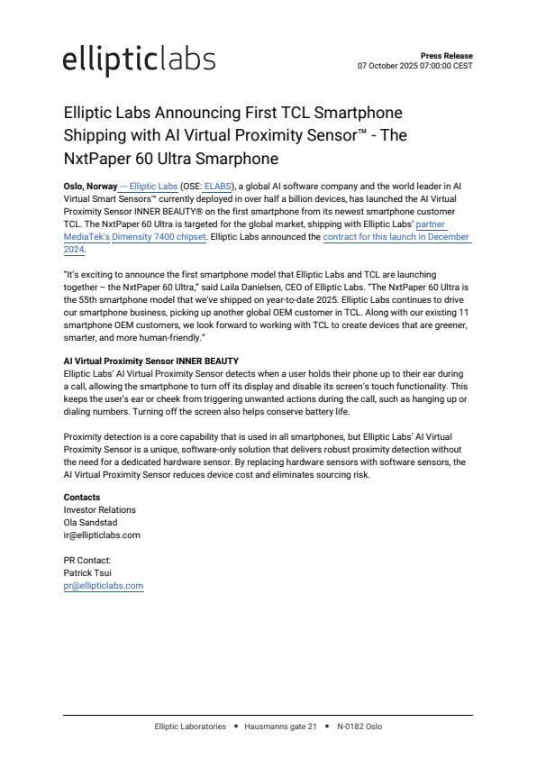 “It’s exciting to announce the first smartphone model that Elliptic Labs and TCL are launching together – the NxtPaper 60 Ultra,” said Laila Danielsen, CEO of Elliptic Labs. “The NxtPaper 60 Ultra is the 55th smartphone model that we’ve shipped on year-to-date 2025. Elliptic Labs continues to drive our smartphone business, picking up another global OEM customer in TCL. Along with our existing 11 smartphone OEM customers, we look forward to working with TCL to create devices that are greener, smarter, and more human-friendly.”