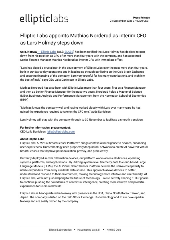 Oslo, Norway — Elliptic Labs (OSE: ELABS) has been notified that Lars Holmøy has decided to step down from his position as CFO after more than four years with the company, and has appointed Senior Finance Manager Mathias Norderud as interim CFO with immediate effect.