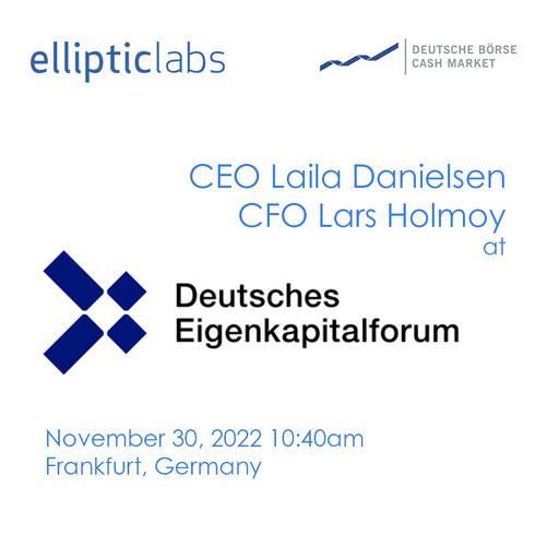 Oslo, Norway — Elliptic Labs (OSE: ELABS), a global AI software company and the world leader in AI Virtual Smart Sensors™, is announcing CEO Laila Danielsen will be presenting at the upcoming Deutsches Eigenkapitalforum in Frankfurt, Germany, on Wednesday, November 30, 2022, at 10:40 am. CFO Lars Holmøy will also be in attendance and participating in the event’s meetings.