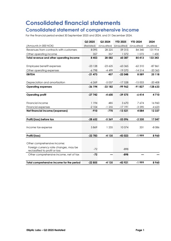 The company previously recognized revenue of NOK 34.2 million related to the contracts in the Income Statement for Q3 2025. The total revenue of NOK 42.6 million previously reported for Q3 2025 will hence be restated to total revenue of NOK 8.5 million. Correspondingly, EBITDA for Q3 2025 will be restated to a loss of NOK 21.5 million, whereas profit before tax for Q3 2025 will be restated to a loss of NOK 28.7 million.