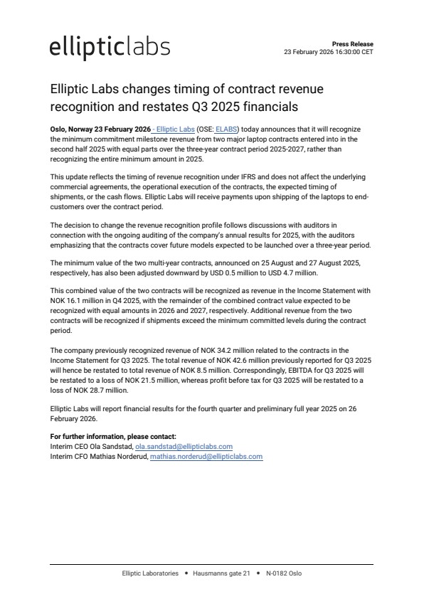 Oslo, Norway 23 February 2026 – Elliptic Labs (OSE: ELABS) today announces that it will recognize the minimum commitment milestone revenue from two major laptop contracts entered into in the second half 2025 with equal parts over the three-year contract period 2025-2027, rather than recognizing the entire minimum amount in 2025.