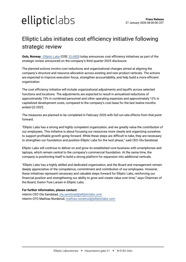 Oslo, Norway – Elliptic Labs (OSE: ELABS) today announces cost efficiency initiatives as part of the strategic review announced on the company’s third quarter 2025 disclosure.