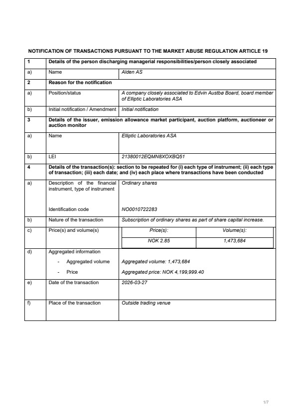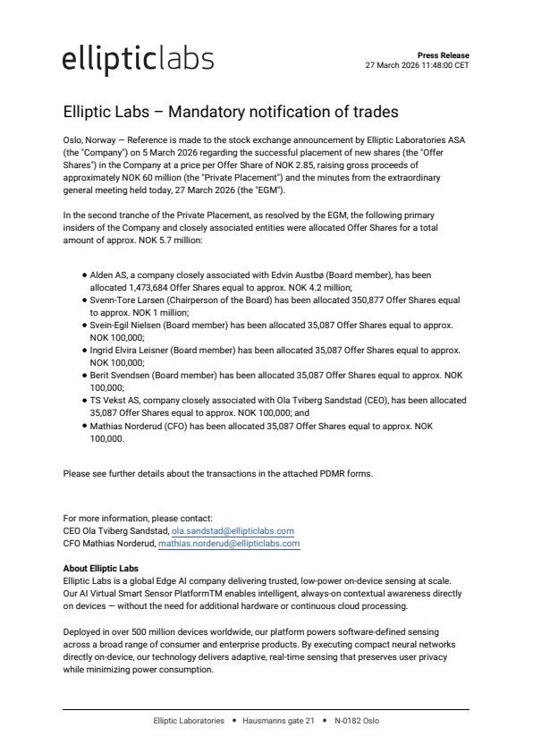 Oslo, Norway — Reference is made to the stock exchange announcement by Elliptic Laboratories ASA (the "Company") on 5 March 2026 regarding the successful placement of new shares (the "Offer Shares") in the Company at a price per Offer Share of NOK 2.85, raising gross proceeds of approximately NOK 60 million (the "Private Placement") and the minutes from the extraordinary general meeting held today, 27 March 2026 (the "EGM").