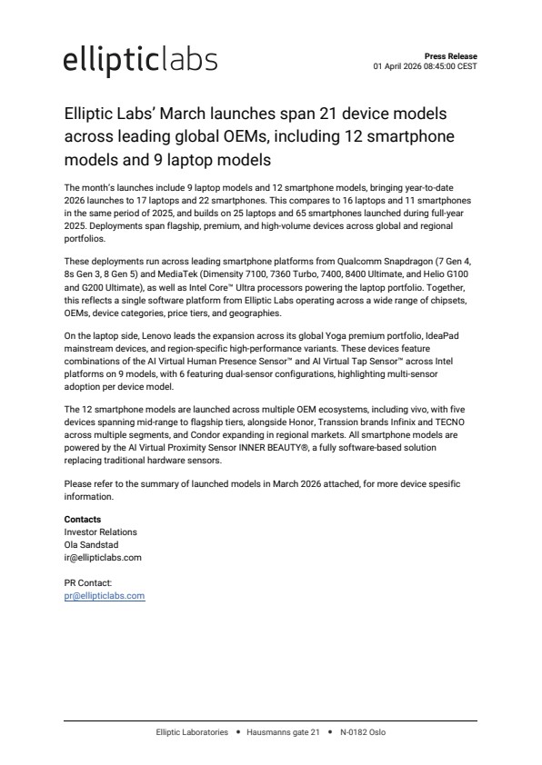 These deployments run across leading smartphone platforms from Qualcomm Snapdragon (7 Gen 4, 8s Gen 3, 8 Gen 5) and MediaTek (Dimensity 7100, 7360 Turbo, 7400, 8400 Ultimate, and Helio G100 and G200 Ultimate), as well as Intel Core™ Ultra processors powering the laptop portfolio. Together, this reflects a single software platform from Elliptic Labs operating across a wide range of chipsets, OEMs, device categories, price tiers, and geographies.