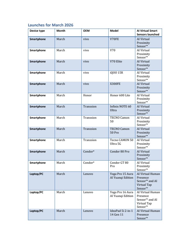 The 12 smartphone models are launched across multiple OEM ecosystems, including vivo, with five devices spanning mid-range to flagship tiers, alongside Honor, Transsion brands Infinix and TECNO across multiple segments, and Condor expanding in regional markets. All smartphone models are powered by the AI Virtual Proximity Sensor INNER BEAUTY®, a fully software-based solution replacing traditional hardware sensors.