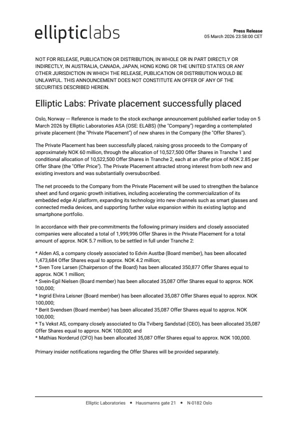 Oslo, Norway — Reference is made to the stock exchange announcement published earlier today on 5 March 2026 by Elliptic Laboratories ASA (OSE: ELABS) (the "Company") regarding a contemplated private placement (the "Private Placement") of new shares in the Company (the "Offer Shares").