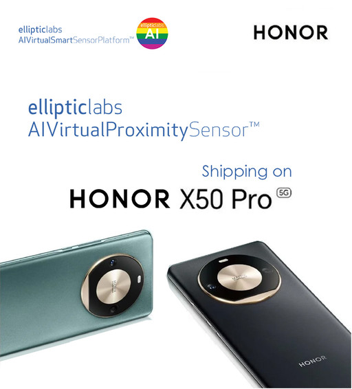 Oslo, Norway — Elliptic Labs (OSE: ELABS), a global AI software company and the world leader in AI Virtual Smart Sensors™ currently deployed in over 500 million devices, is launching its AI Virtual Proximity Sensor™ INNER BEAUTY® on HONOR’s newest smartphone, the HONOR X50 Pro, for the Chinese market. Elliptic Labs’ partner Qualcomm is at the core of the HONOR X50 Pro with its Snapdragon 8+ Gen 1 chipset. The contract for this launch was previously announced by Elliptic Labs.