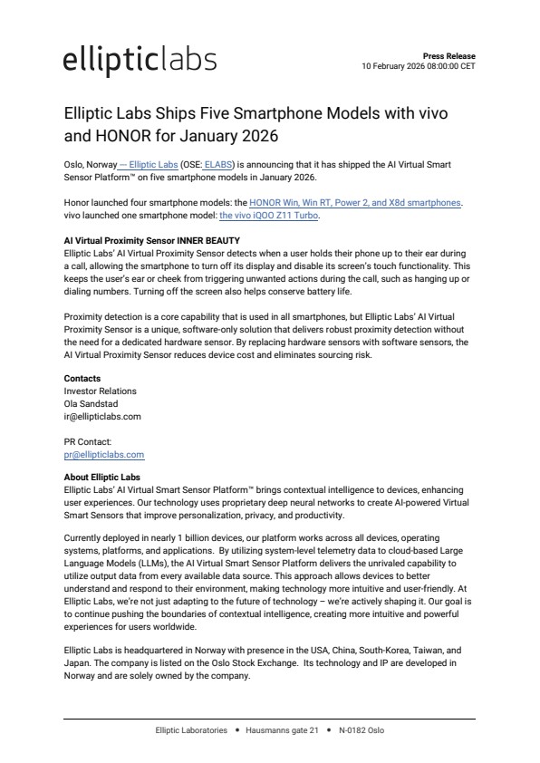 Oslo, Norway — Elliptic Labs (OSE: ELABS) is announcing that it has shipped the AI Virtual Smart Sensor Platform™ on five smartphone models in January 2026.