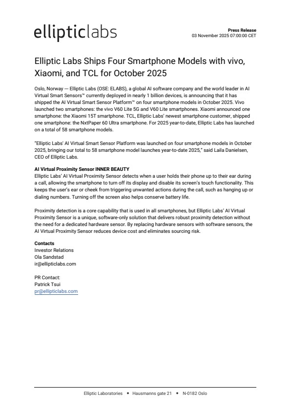 “Elliptic Labs' AI Virtual Smart Sensor Platform was launched on four smartphone models in October 2025, bringing our total to 58 smartphone model launches year-to-date 2025,” said Laila Danielsen, CEO of Elliptic Labs.