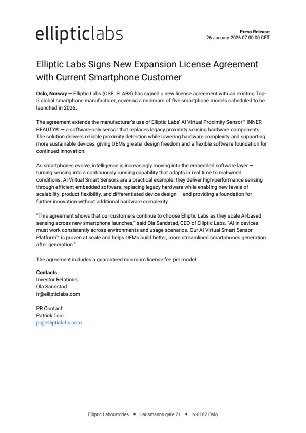 Oslo, Norway — Elliptic Labs (OSE: ELABS) has signed a new license agreement with an existing Top-5 global smartphone manufacturer, covering a minimum of five smartphone models scheduled to be launched in 2026.