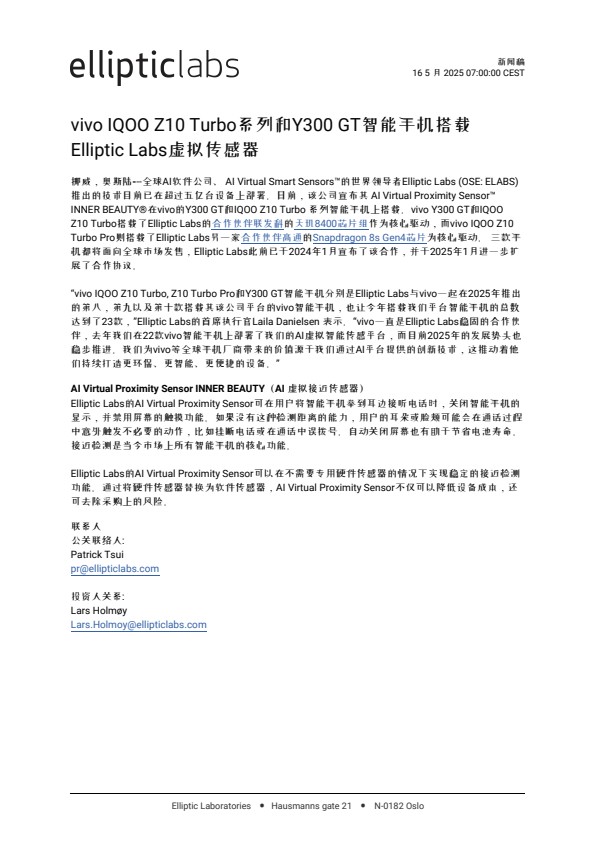 挪威,奥斯陆-–全球AI软件公司、 AI Virtual Smart Sensors™的世界领导者Elliptic Labs (OSE: ELABS)推出的技术目前已在超过五亿台设备上部署。日前,该公司宣布其 AI Virtual Proximity Sensor™ INNER BEAUTY®在vivo的Y300 GT和IQOO Z10 Turbo 系列智能手机上搭载。vivo Y300 GT和IQOO Z10 Turbo搭载了Elliptic Labs的合作伙伴联发科的天玑8400芯片组作为核心驱动,而vivo IQOO Z10 Turbo Pro则搭载了Elliptic Labs另一家合作伙伴高通的Snapdragon 8s Gen4芯片为核心驱动。 三款手机都将面向全球市场发售,Elliptic Labs此前已于2024年1月宣布了该合作,并于2025年1月进一步扩展了合作协议。