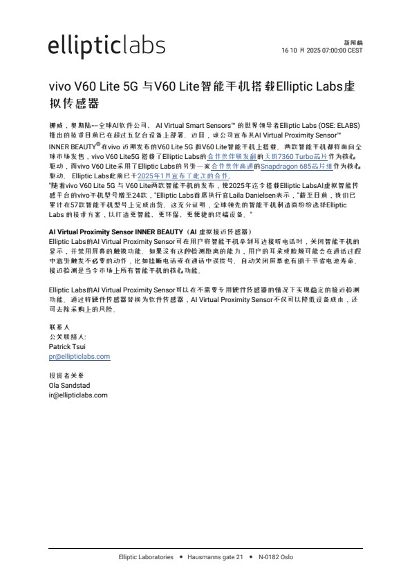 挪威,奥斯陆-–全球AI软件公司、 AI Virtual Smart Sensors™ 的世界领导者Elliptic Labs (OSE: ELABS) 推出的技术目前已在超过五亿台设备上部署。近日,该公司宣布其AI Virtual Proximity Sensor™ INNER BEAUTY®在vivo 近期发布的V60 Lite 5G 和V60 Lite智能手机上搭载。两款智能手机都将面向全球市场发售,vivo V60 Lite5G 搭载了Elliptic Labs的合作伙伴联发科的天玑7360 Turbo芯片作为核心驱动,而vivo V60 Lite采用了Elliptic Labs的另外一家合作伙伴高通的Snapdragon 685芯片组作为核心驱动。 Elliptic Labs此前已于2025年1月宣布了此次的合作。